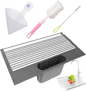 20インチ x 11インチ シンク上 多目的 ロールアップ 食器乾燥ラック 大型食器乾燥ラック 台所用品ホルダー付き 折りたたみ可能 ステンレススチール キッチン食器水切りラック