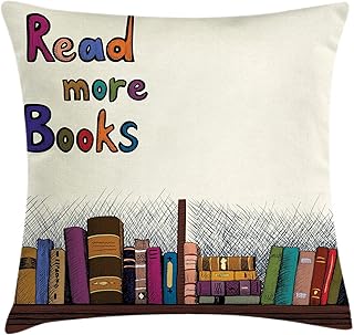 Ambesonne ブックスローピロークッションカバー スケッチの背景に印刷された文字を読む 棚にカラフルな本付き 装飾正方形アクセント枕カバー 16インチ x 16インチ オフホワイト