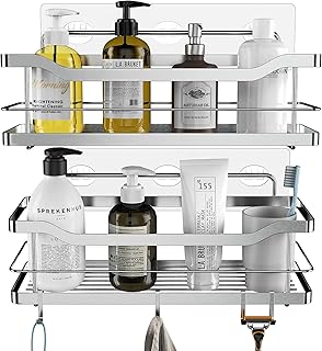 AOBER 粘着シャワーキャディ 可動フック付き ドリル不要 シャワーオーガナイザー 防錆 304 ステンレススチールシャワーシェルフ 2個パック シルバー