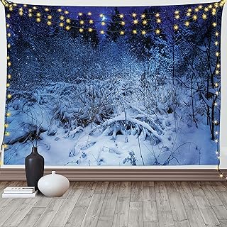 Lunarable クリスマス タペストリー キングサイズ 夜の雪の森 クリスマス スター ホリデー ブリザード 冬の空 宇宙 壁掛け ベッドスプレッド ベッドカバー 壁装飾 104インチ x 88インチ ネイビーブルー ホワイト
