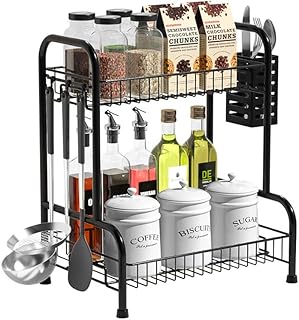 スパイスラックオーガナイザー カウンタートップ キッチンオーガナイザー ストレージシェルフ用 2段スタンディング調味料ラック キッチンホルダー コーヒージャー 調味料ストレージ フック3個付き ブラック