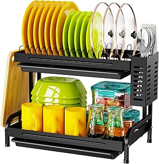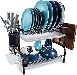 Cambond 食器乾燥ラック 水切りボード付き 2段 高耐久 キッチンカウンター用ディッシュラック 錆びにくい 丈夫な食器水切り器 キッチンホルダー まな板ホルダー付き ブラック