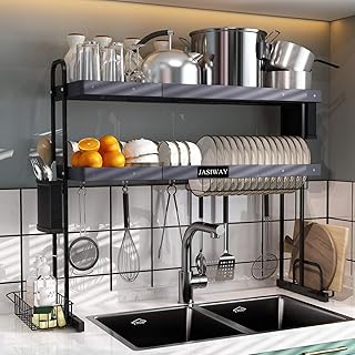 JASIWAY キッチンカウンターオーガナイザーストレージスペースセーバー キッチンホルダー ナイフホルダー フック6個付き 拡張可能 ステンレススチール 2段 食器乾燥ラック シンクシェルフ
