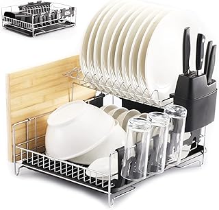 シンクの上に置いた食器乾燥ラック 長さ調節可能 (21~37インチ) 2段 ステンレススチール キッチンディッシュラック キッチンカウンター用 大型ディッシュラック カップ付き まな板 キッチンホルダー